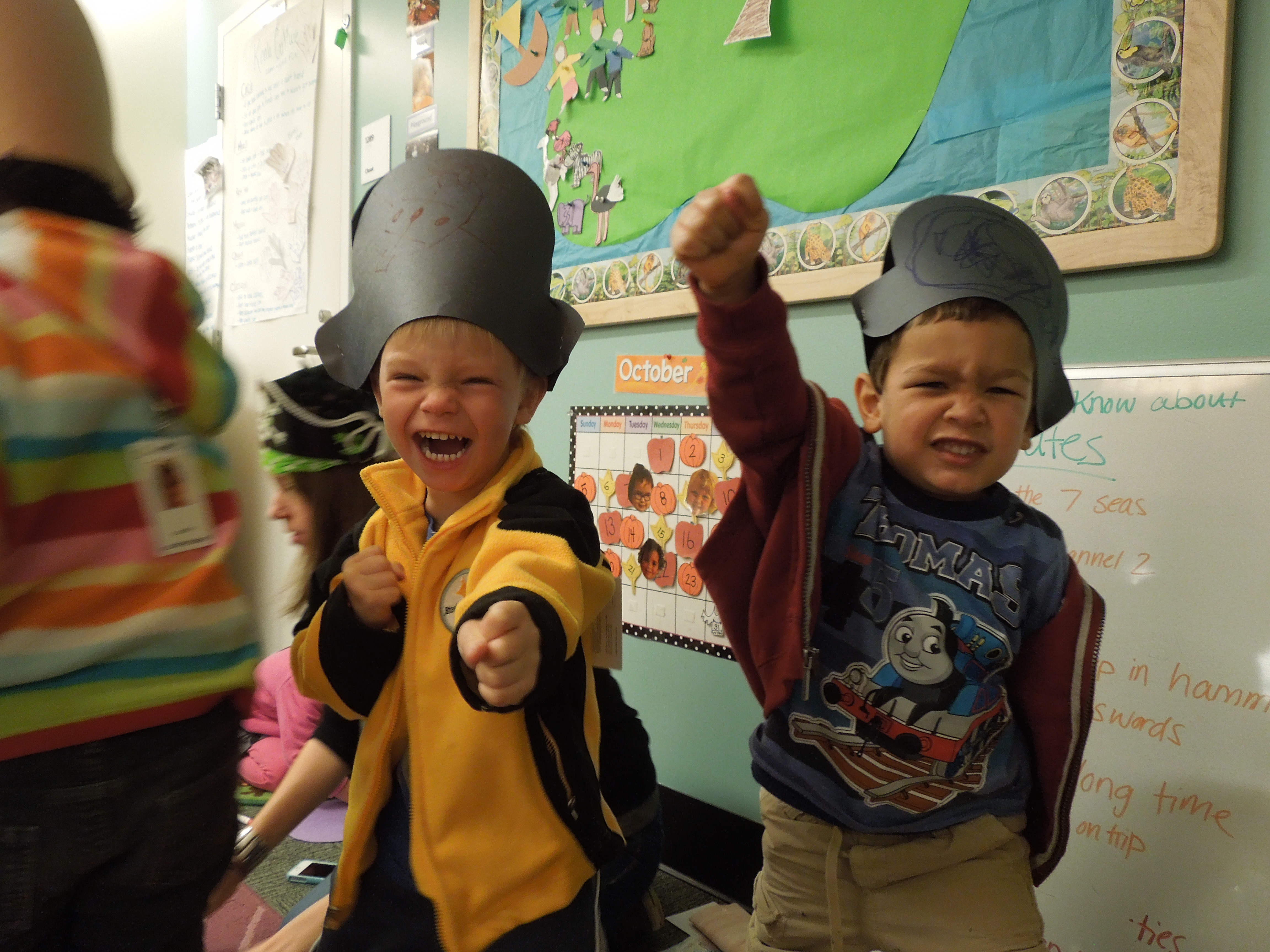 Brooke began her lesson by revisiting the themes and story line of The Swiss Family Robinson before introducing her theme for the week: pirates! The kids were so excited! Brooke spread out a collection of pirate themed books for the kids to look at and then asked the group what they knew about pirates.