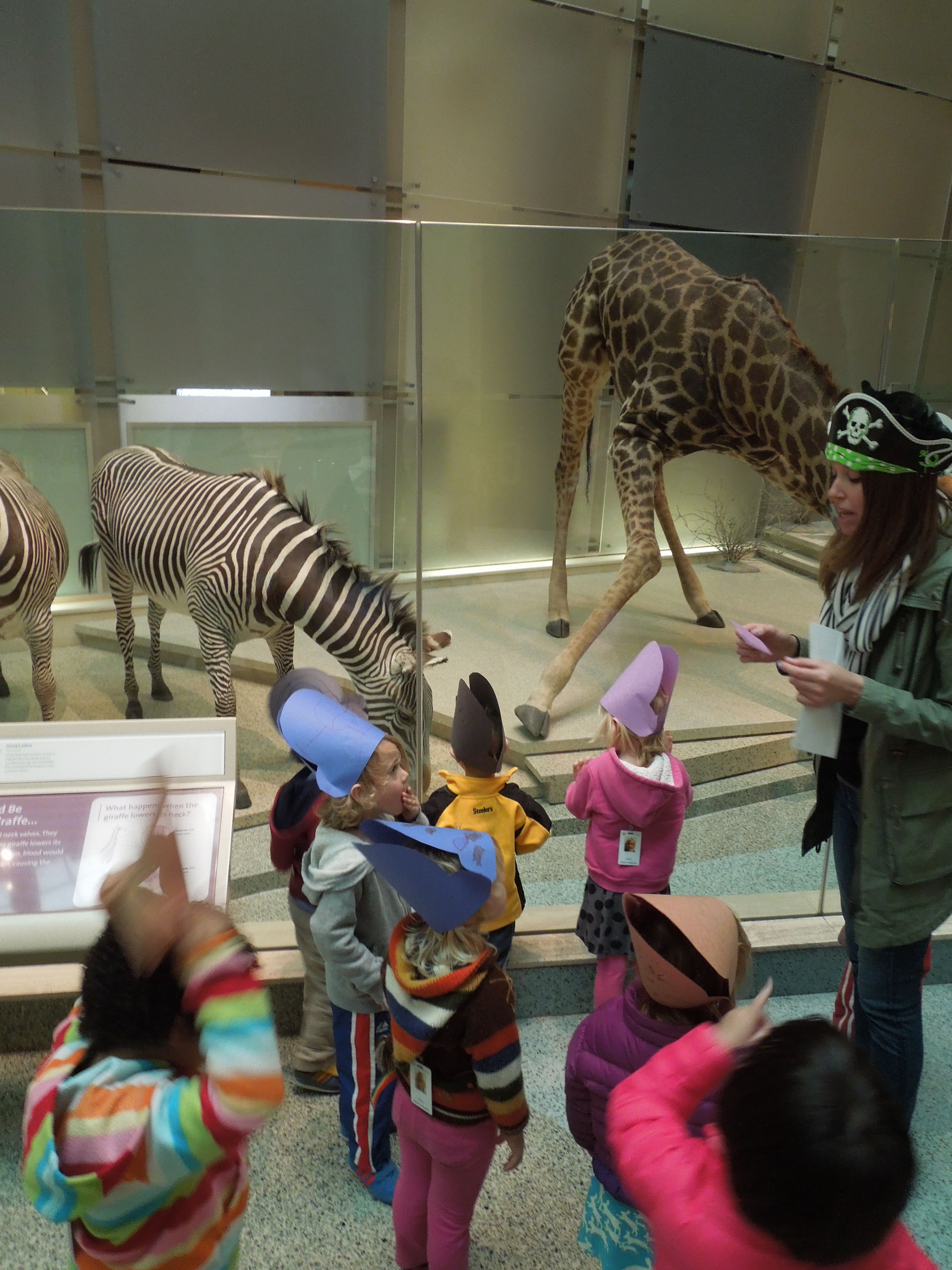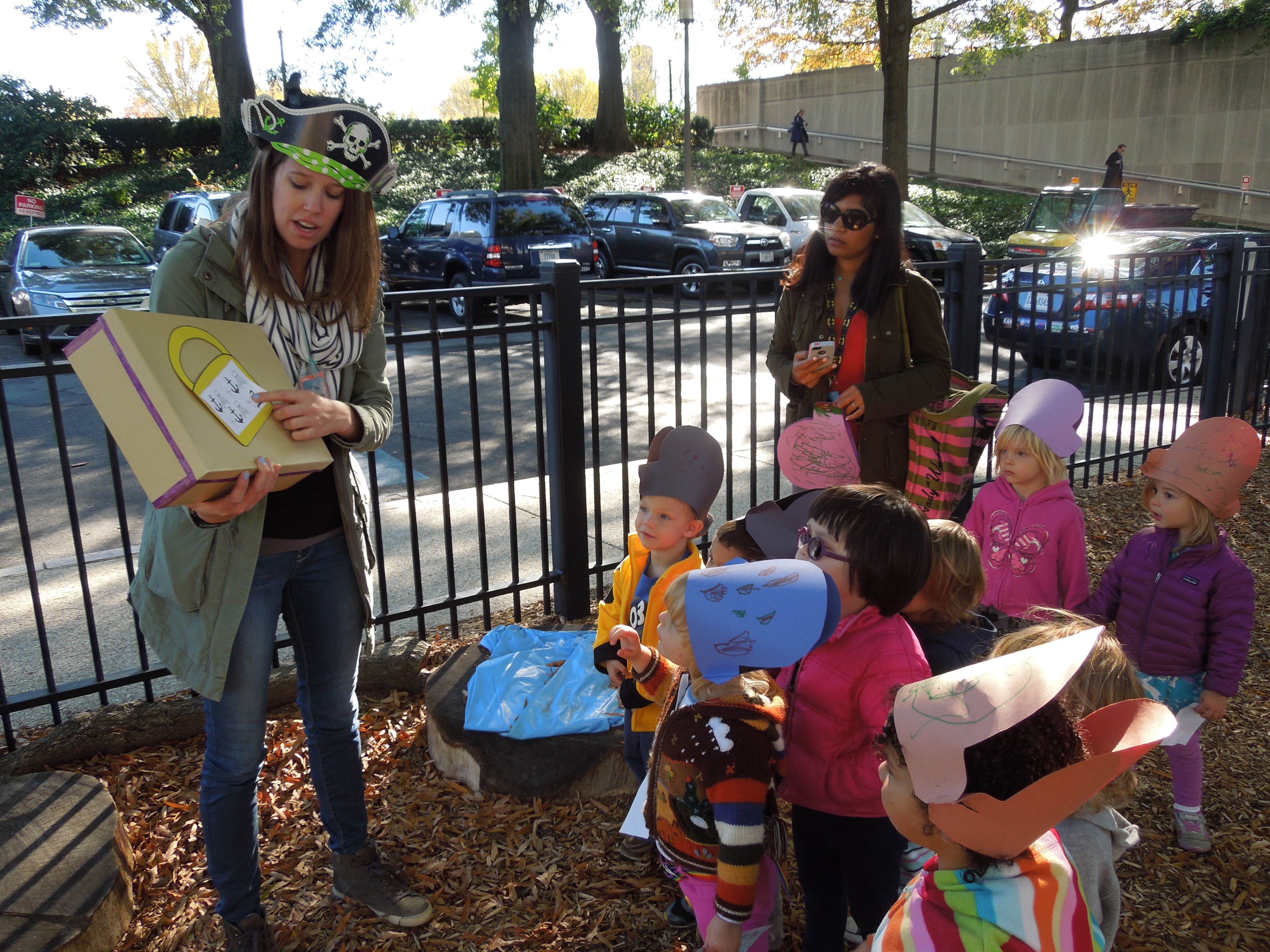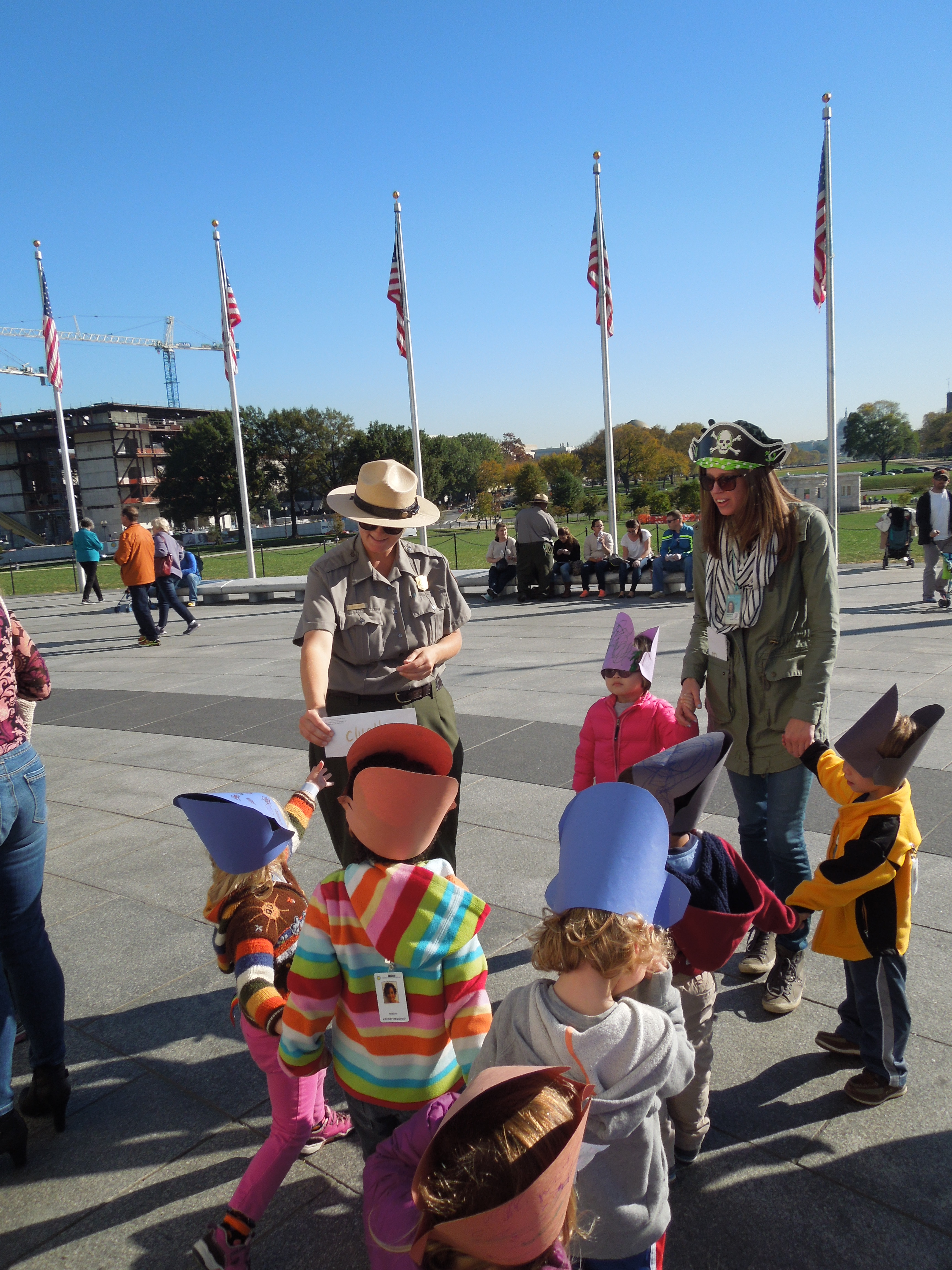 Brooke then passed out pre-cut pirate hats for the children to decorate and wear during their scavenger hunt. As you can see they loved them! She then explained that the class was going on a treasure hunt around the National Mall. Brooke had written clues prior to the lesson that would guide the group to some of the places they had visited during their unit on The Swiss Family Robinson. She wanted to use this activity as a way to summarize their past topics.