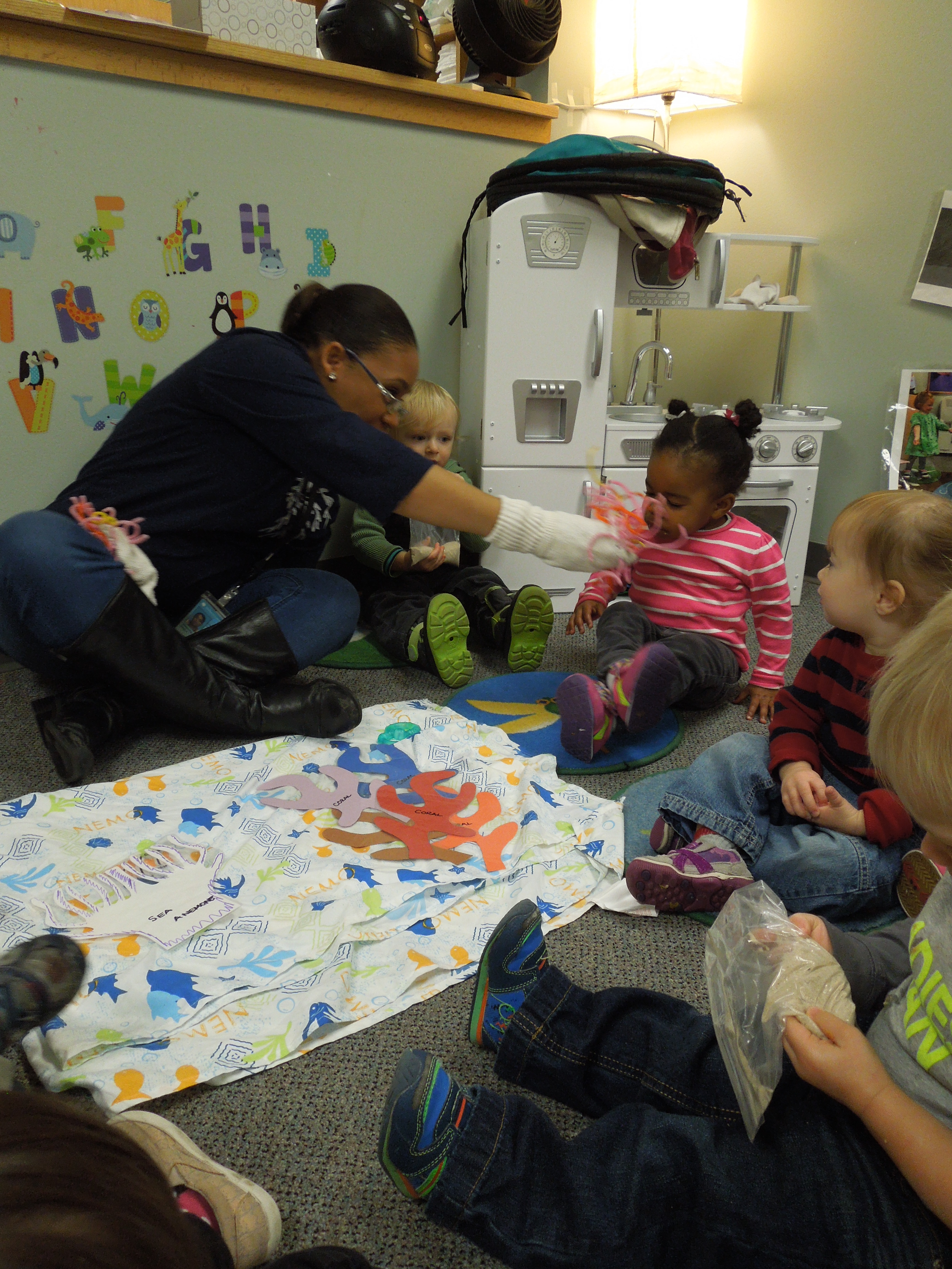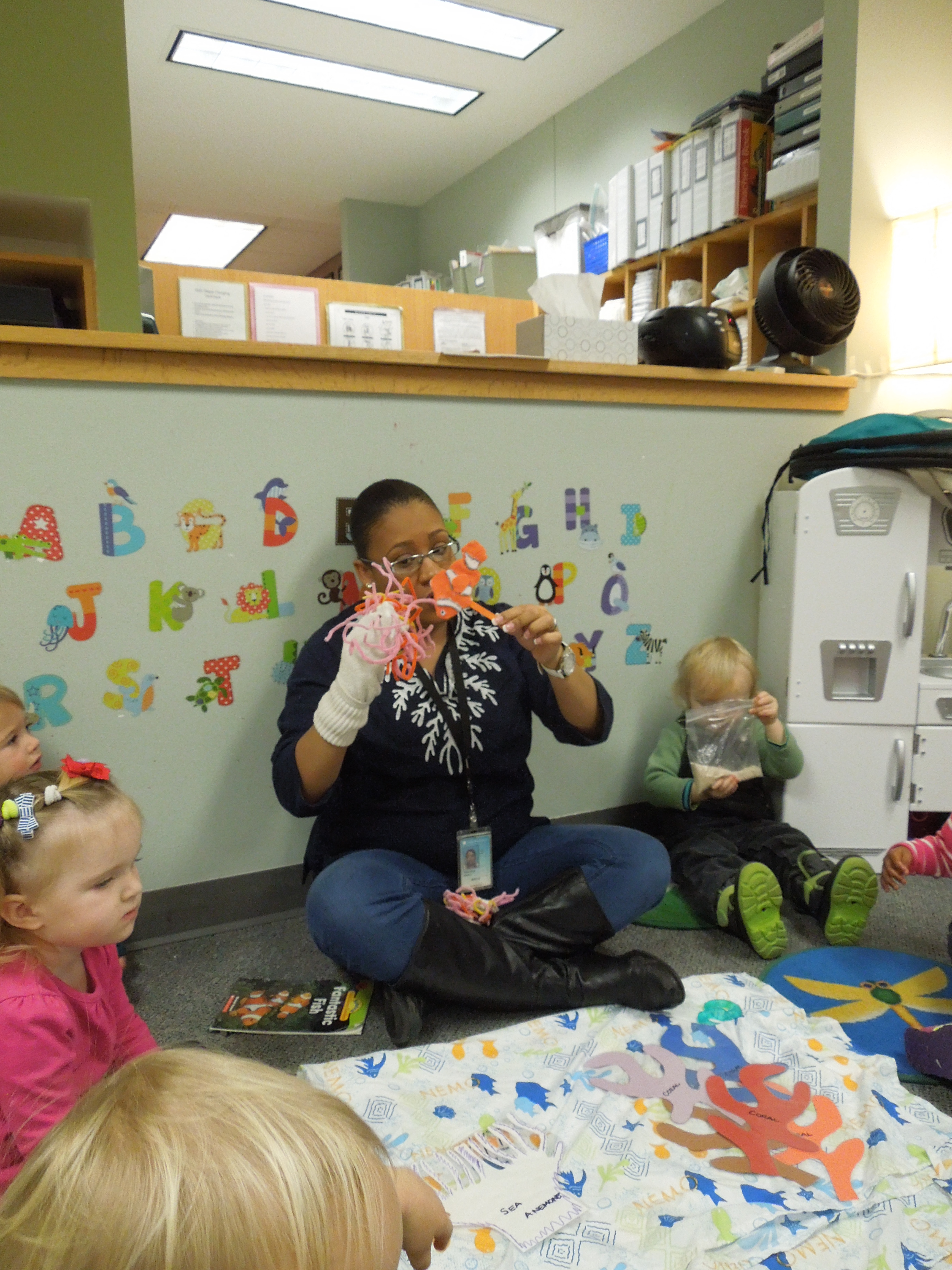 She asked one of the other teachers to be a predator trying to catch the clown fish and Dana told the children to quickly hide in the anemone (the tunnel). The kids had a blast playing in the museum.