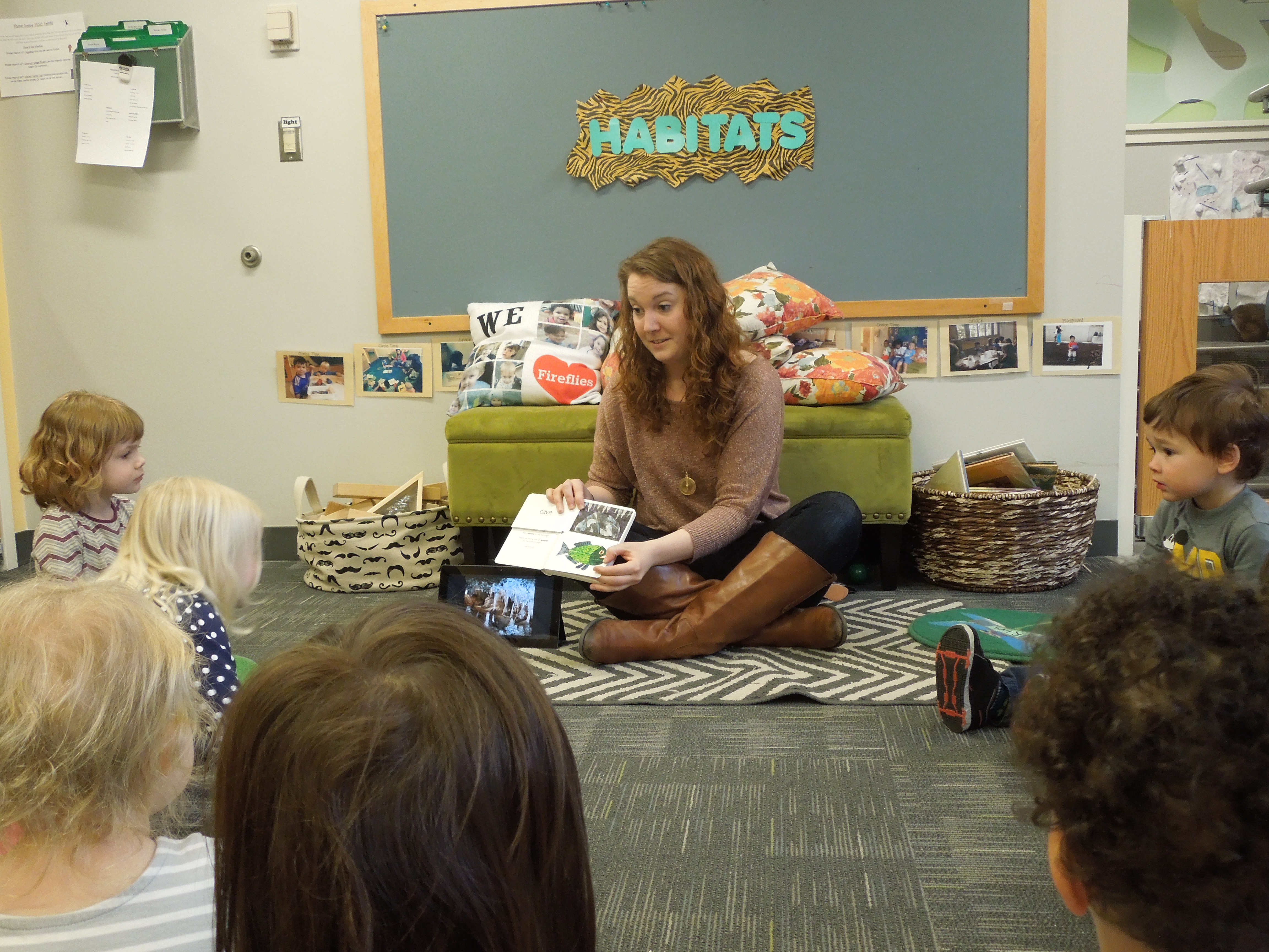 Elaine began her lesson by re-introducing the group to caves. She then ready My First Book of Animals Homes by Eric Carle. The pages of the book are split so the top and the bottom pages turn independently, allowing the children to match which animal goes with each habitat. The students were excited when they were able to match the bat with the cave.