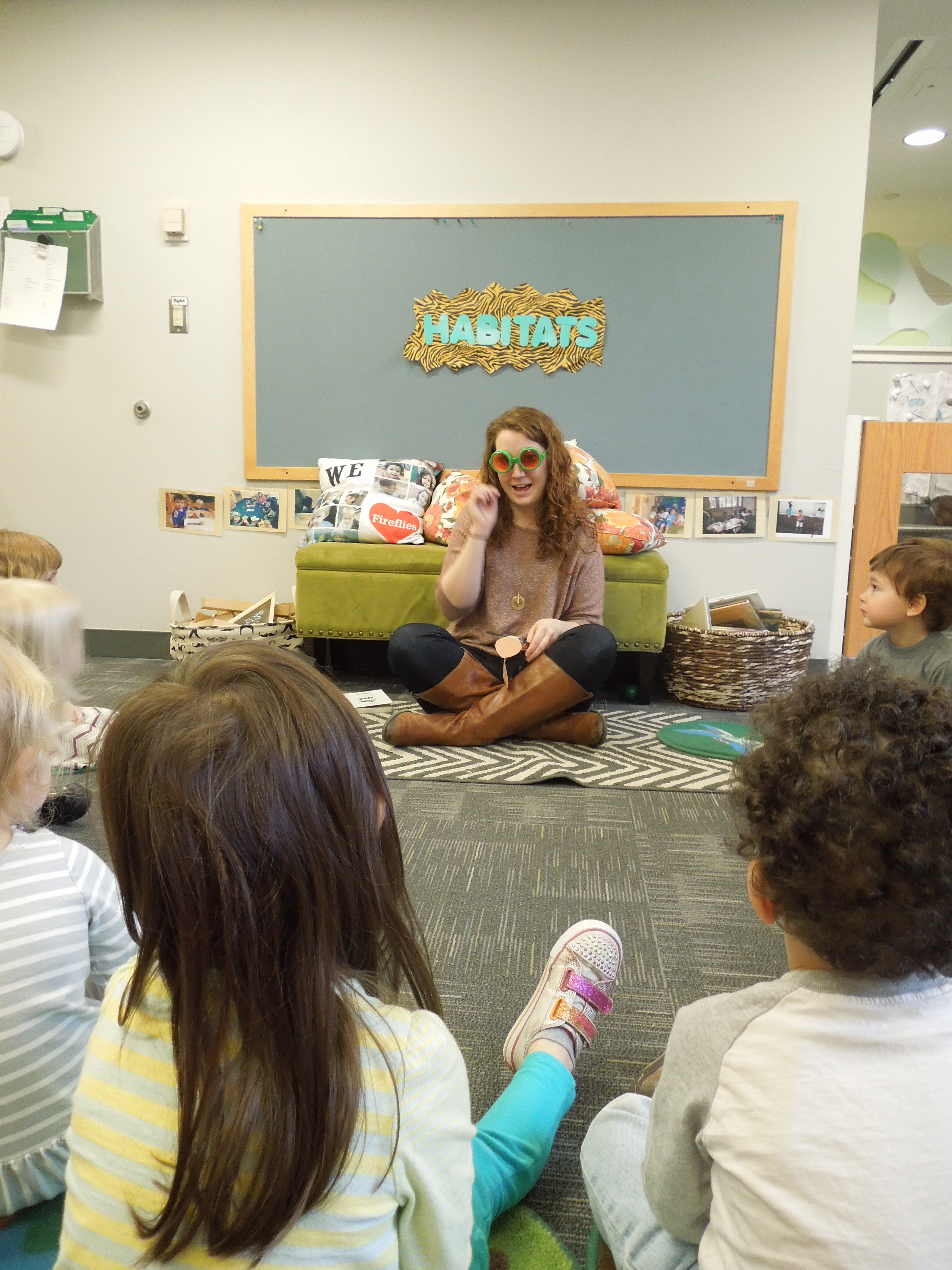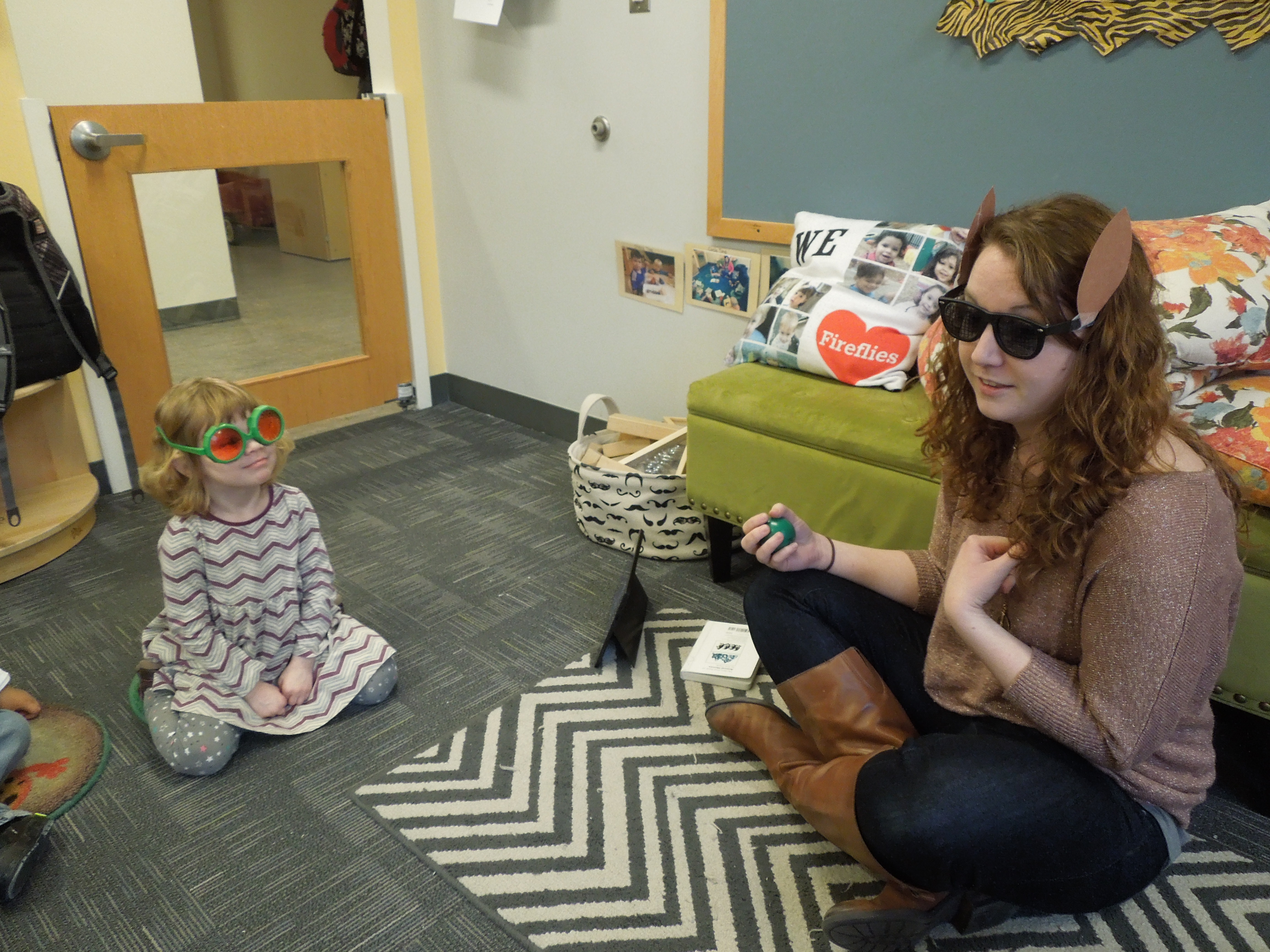 Elaine explained to the group that because of their environment bats need to use echolocation or a special type of hearing to catch their food. She used the green glasses as a way for the children to assume the bug character and black sunglasses with sharpie darkened lenses to become the bat.