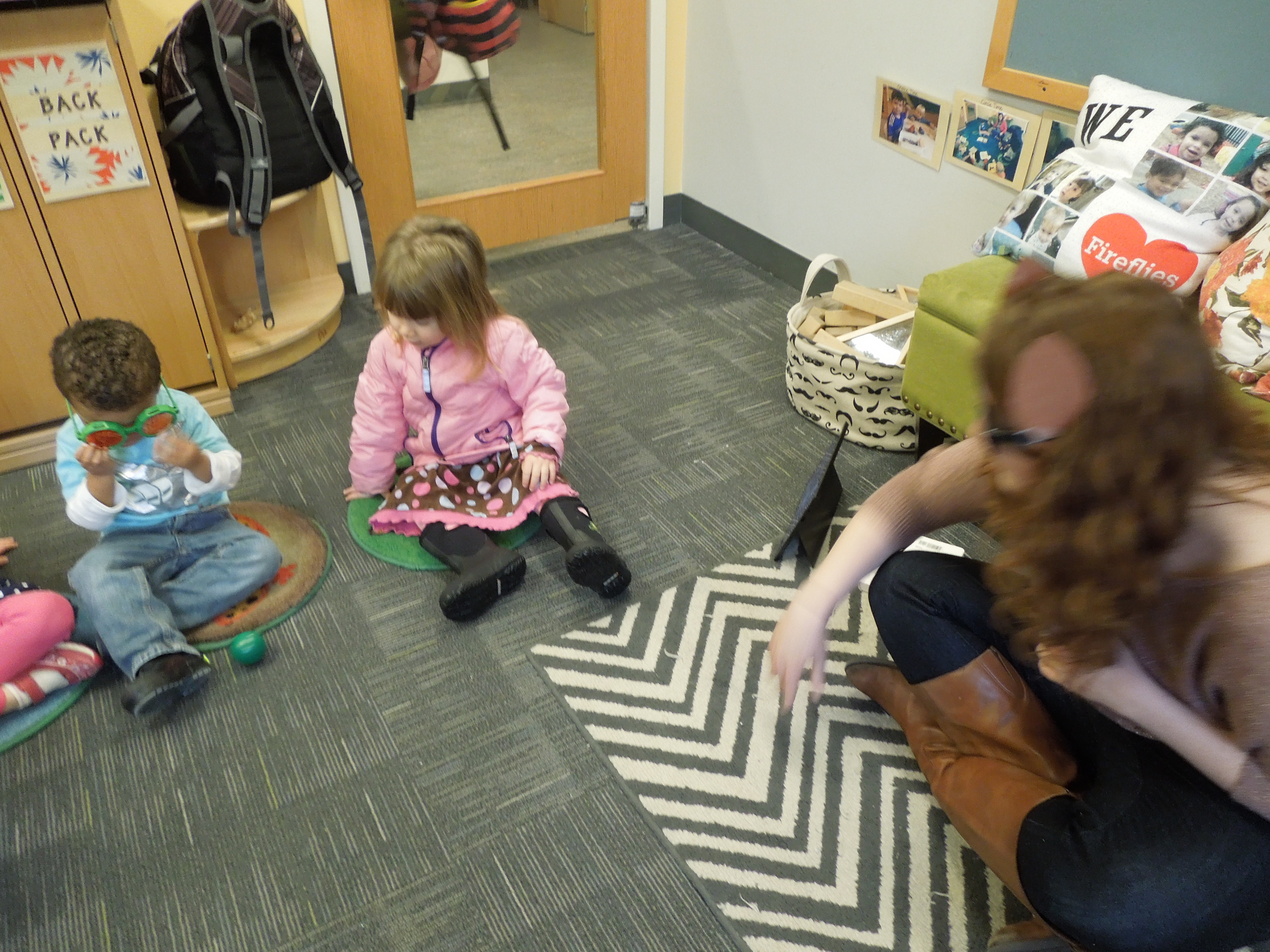 The most successful part of the lesson was the echolocation game we played during circle time. The class was very excited to pretend to be insects while I pretended to be a bat using echolocation to find and eat them. The silly bug and bat goggles helped them get into character. They were also able to demonstrate the way sound bounces from a bat, to the insect, then back to the bat’s ear by rolling a ball back and forth.