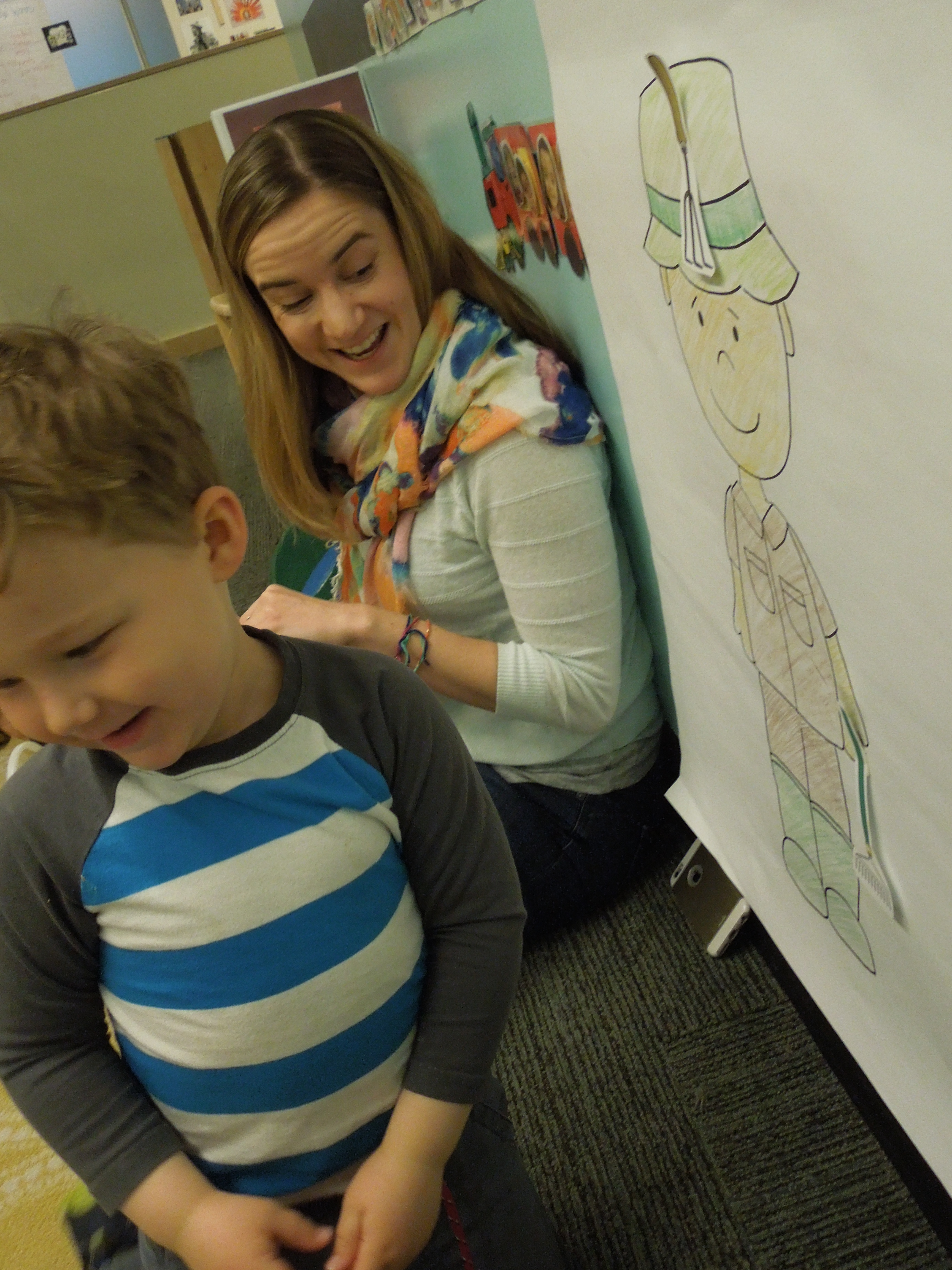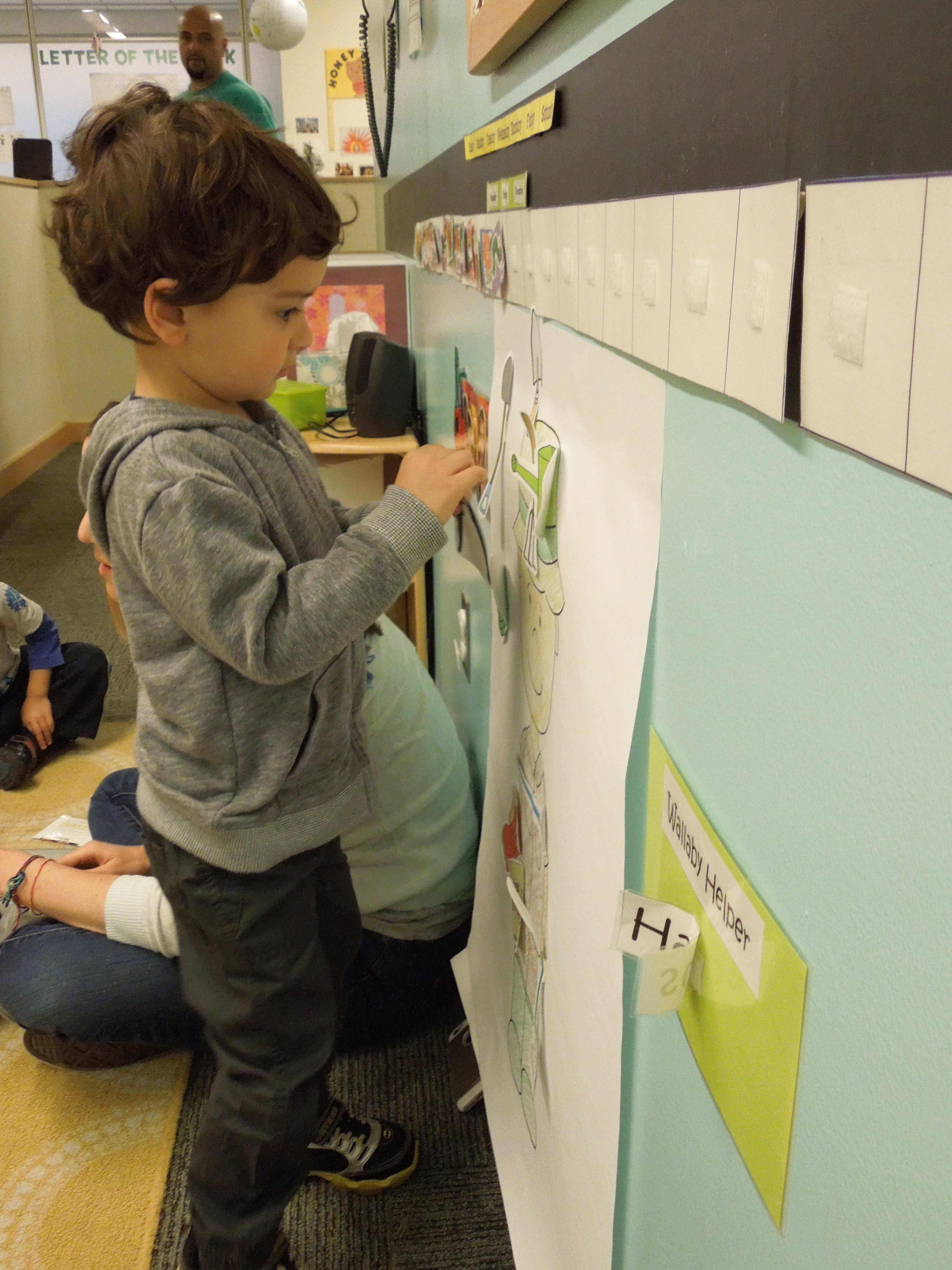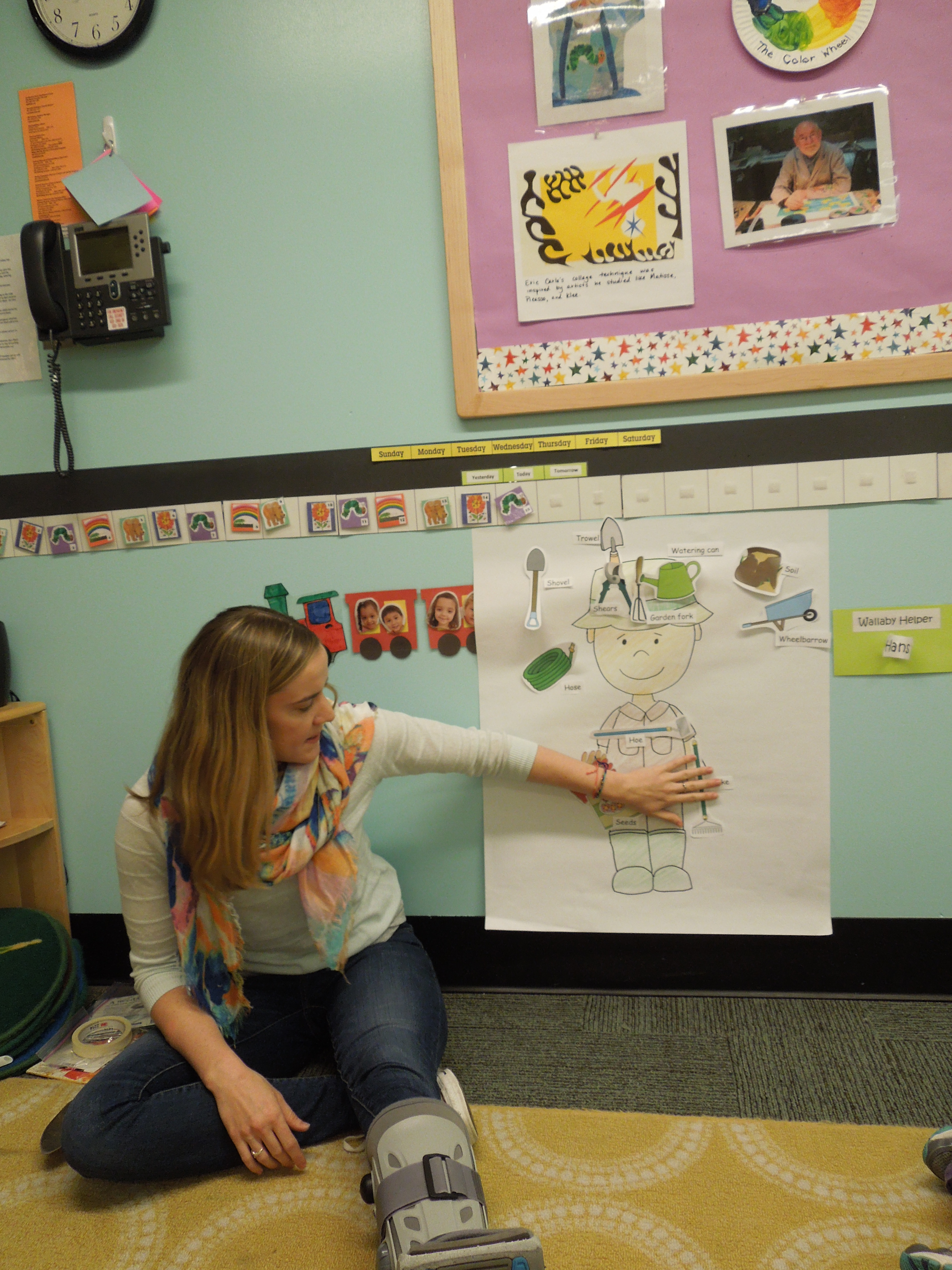 “Gus” needs his tools! Erin invited each child to pick a picture of a garden tool and add it to the image. They all worked together to try and identify the different images.