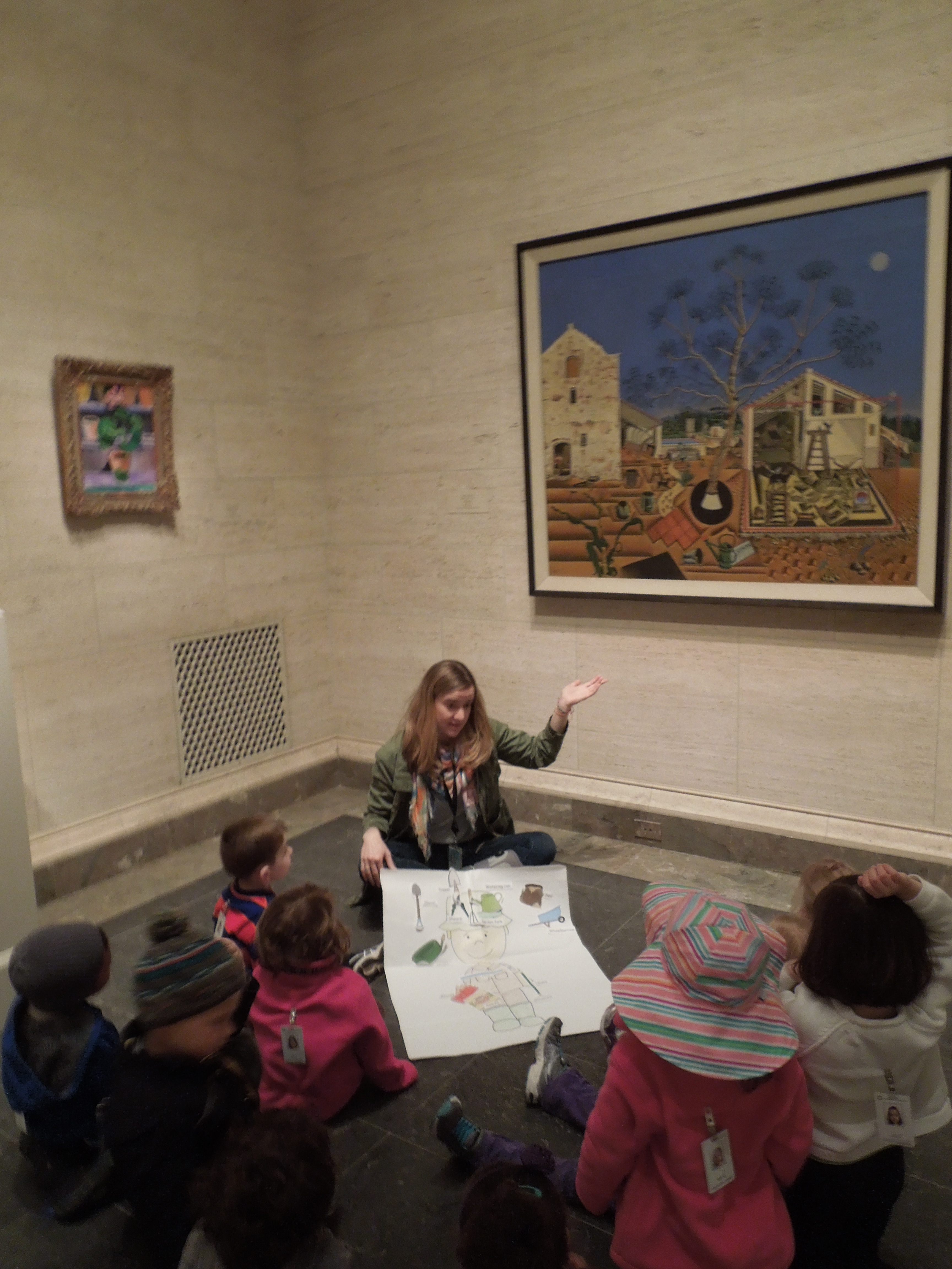 The final stop was to see Miro’s The Farm and Matisse’s Pot of Geraniums. Erin asked the group to do some close looking and describe what they saw in the two paintings. She emphasized that these paintings were both of gardens but one would be found indoors and the other outdoors. Erin then brought out “Gus” and had the group work together to identify which tools could be used to plant in either garden or both.