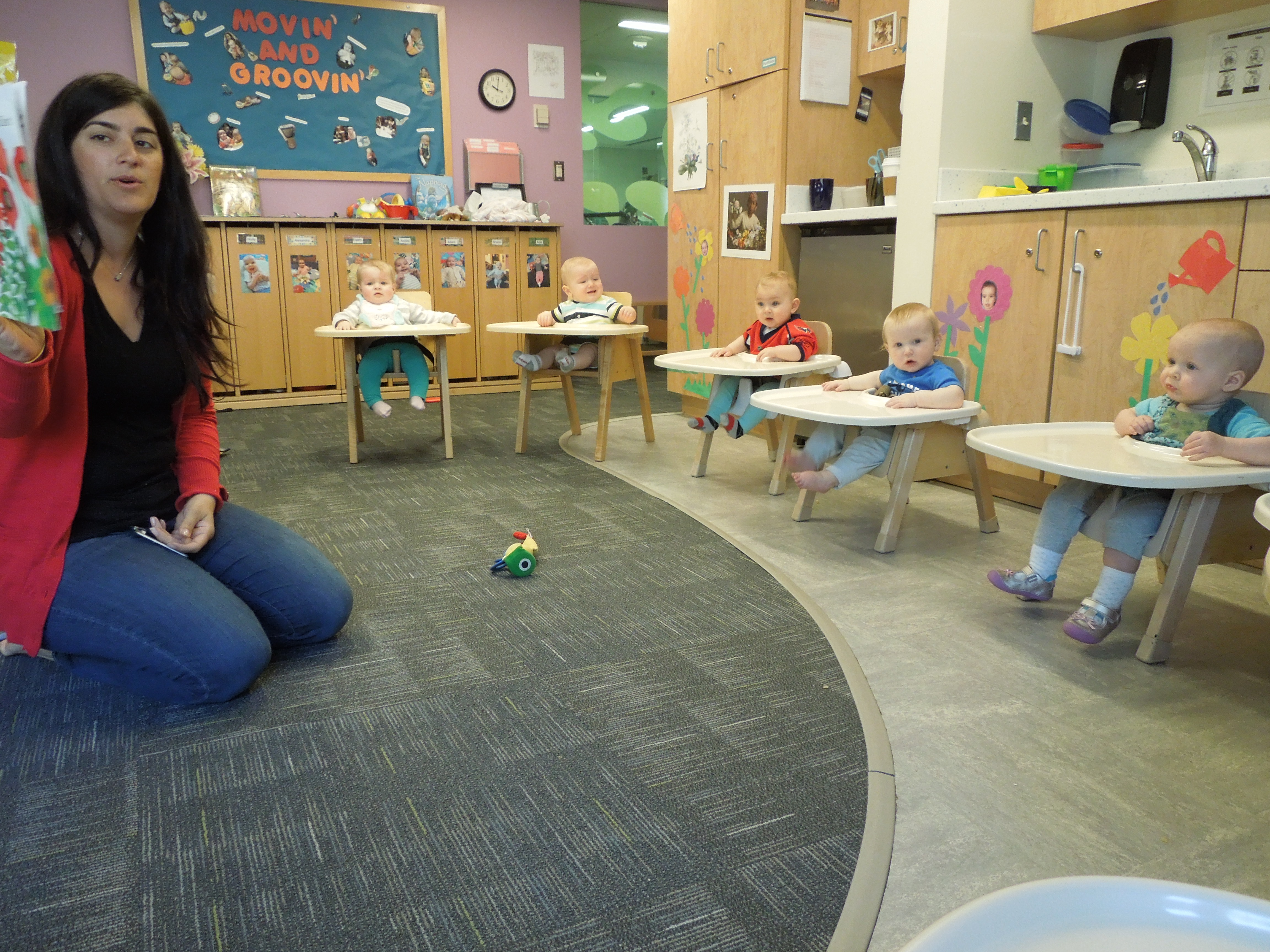 Nessa began the lesson by reading Planting a Rainbow by Lois Ehlert. The team had the children sit in high chairs so they could have a nice flat and accessible surface to do their painting.