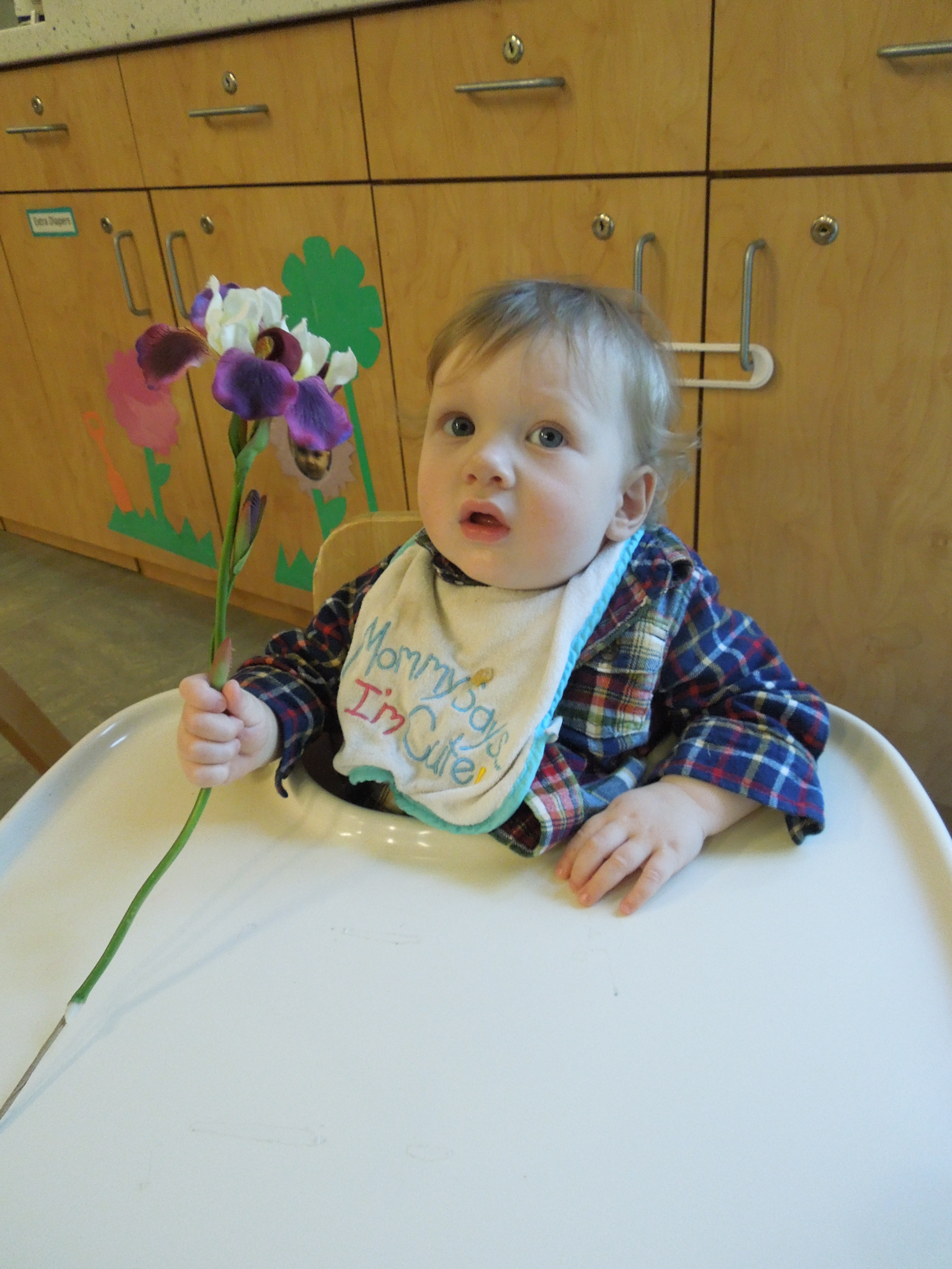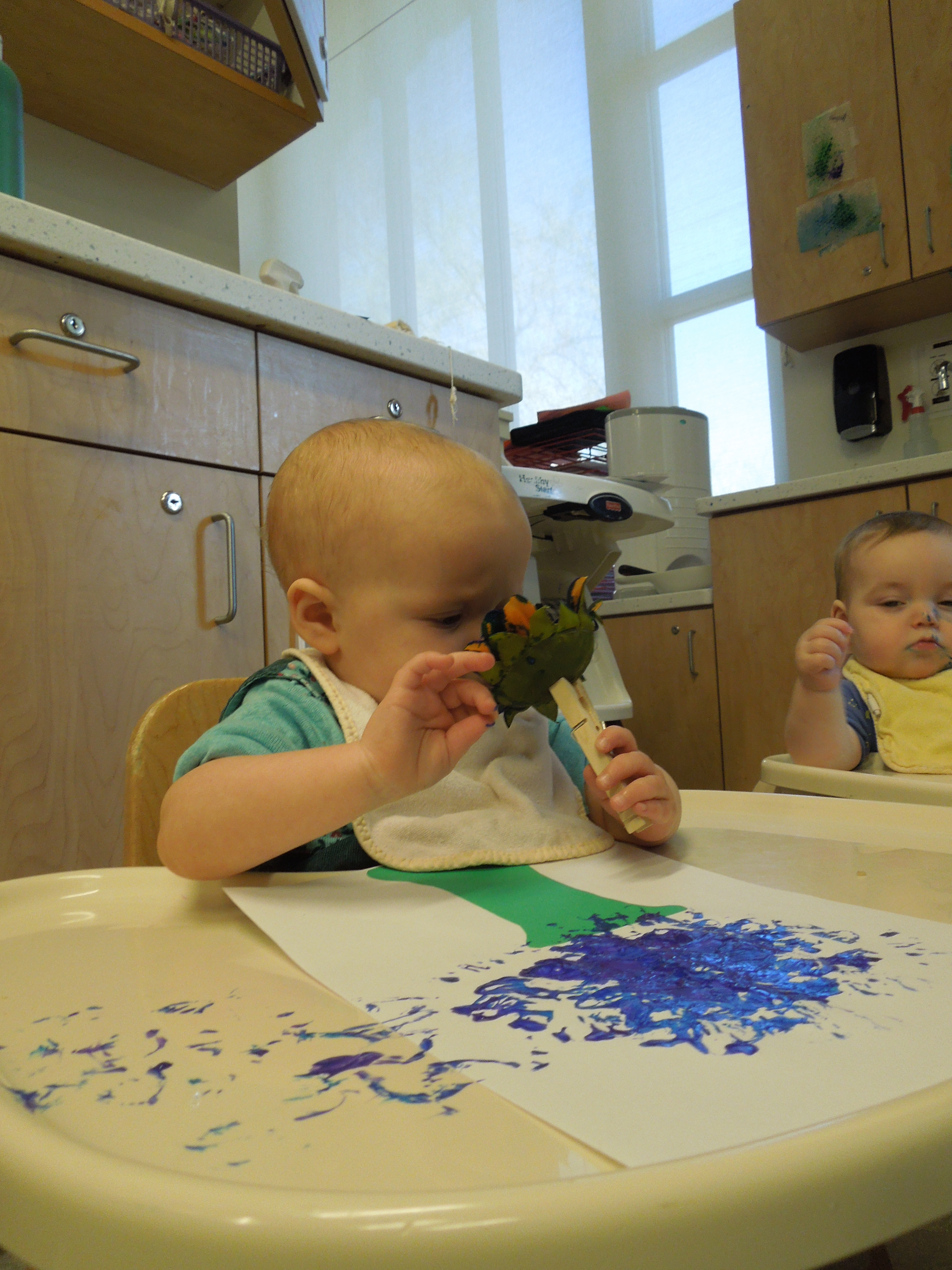 The teachers added a clothes pin to the shortened stem of the silk flower so they would be able to get a better grip. This was great activity for them to work on their fine motor skills. In addition, the babies began to notice that the painted blossom leaves marks where ever it lands.