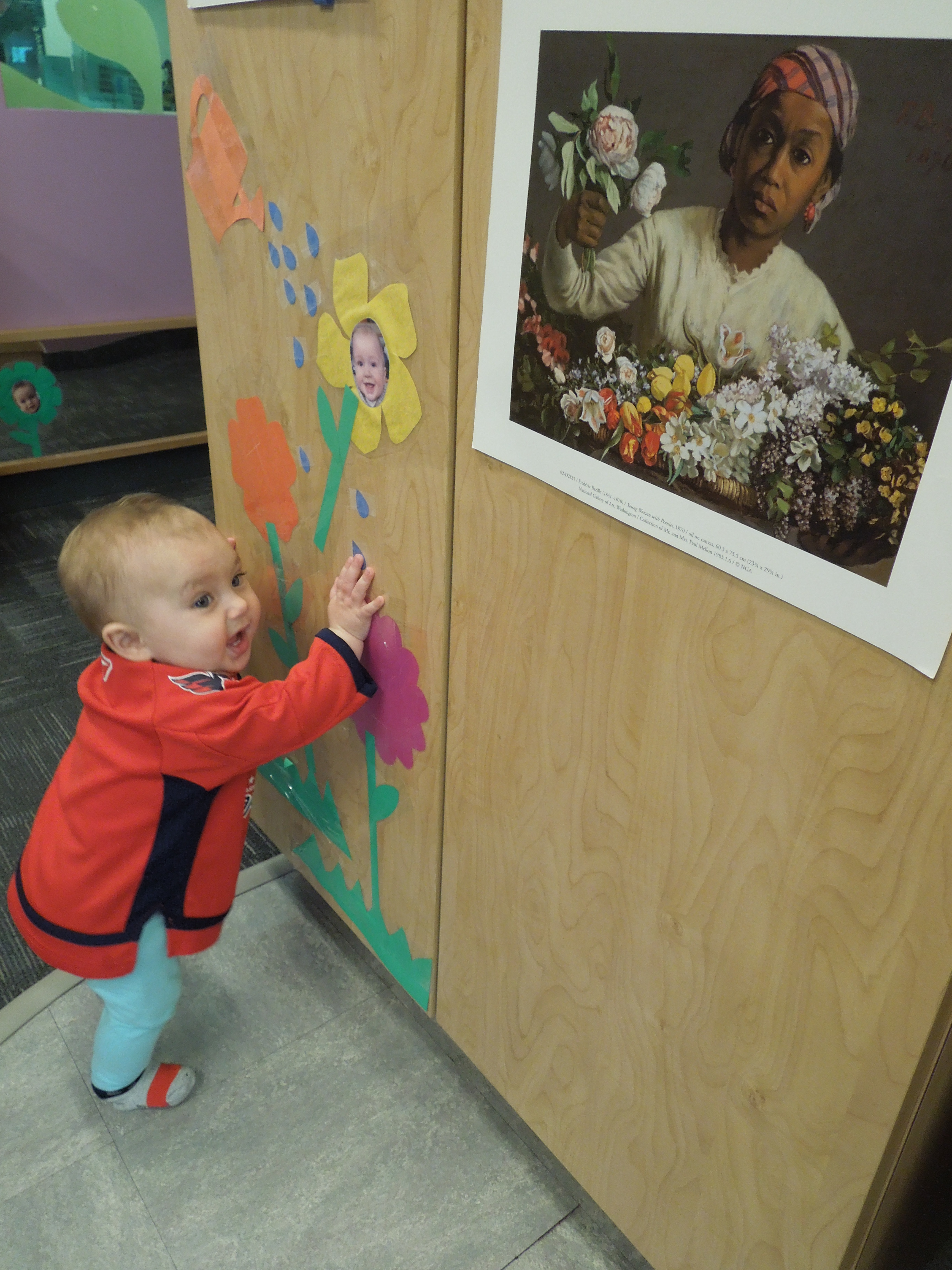 The teachers decorated their room with images of flowers, art prints, and images of the children. After painting, this little girl came over to check out the paper flowers on the wall.