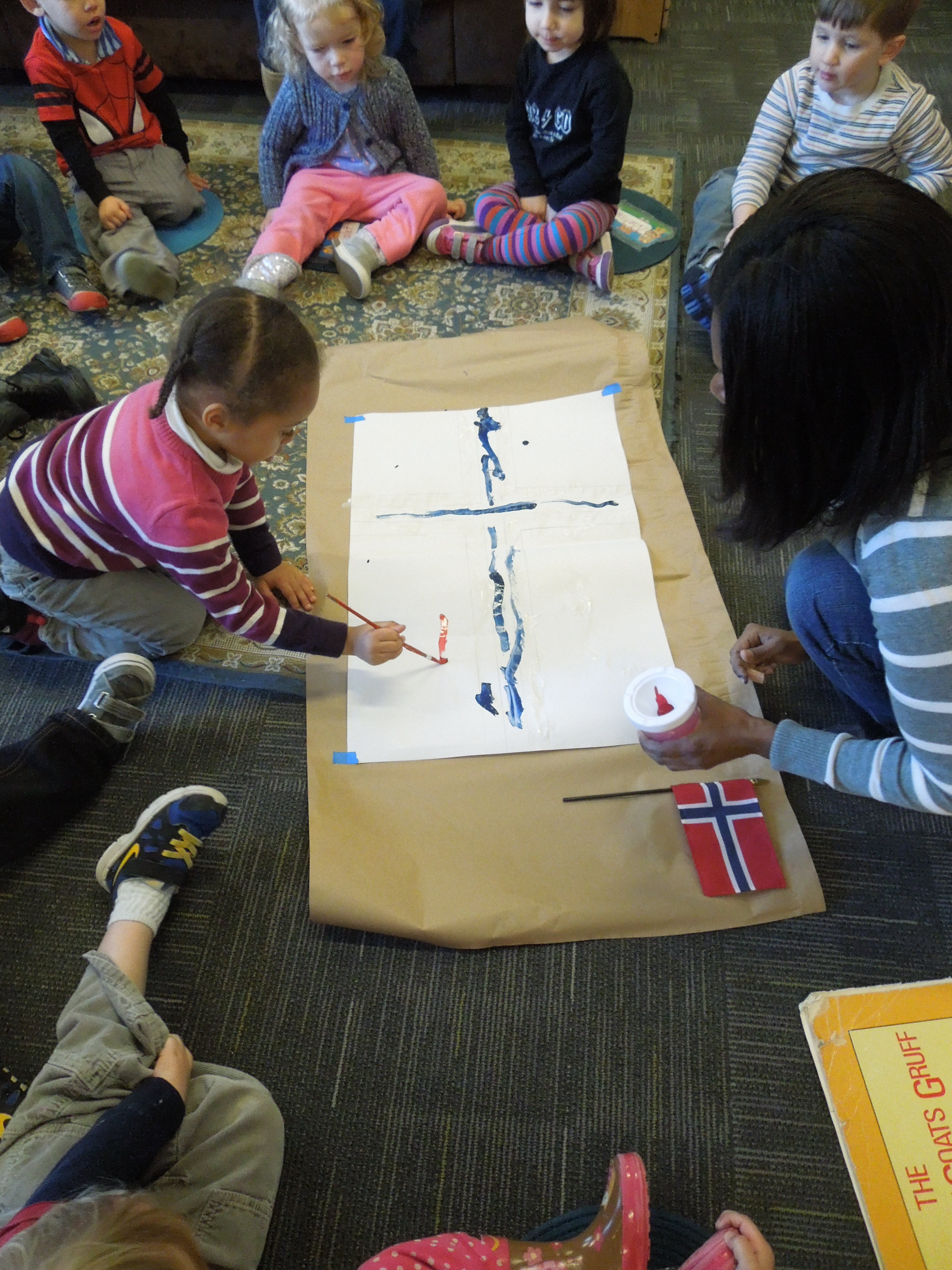 Two year olds learning about Frozen took time to get to know about the country on which it is meant to be based. Here they are painting their own Norwegian flag before reading a Norwegian folk tale and learning about the animals that inhabit that region.
