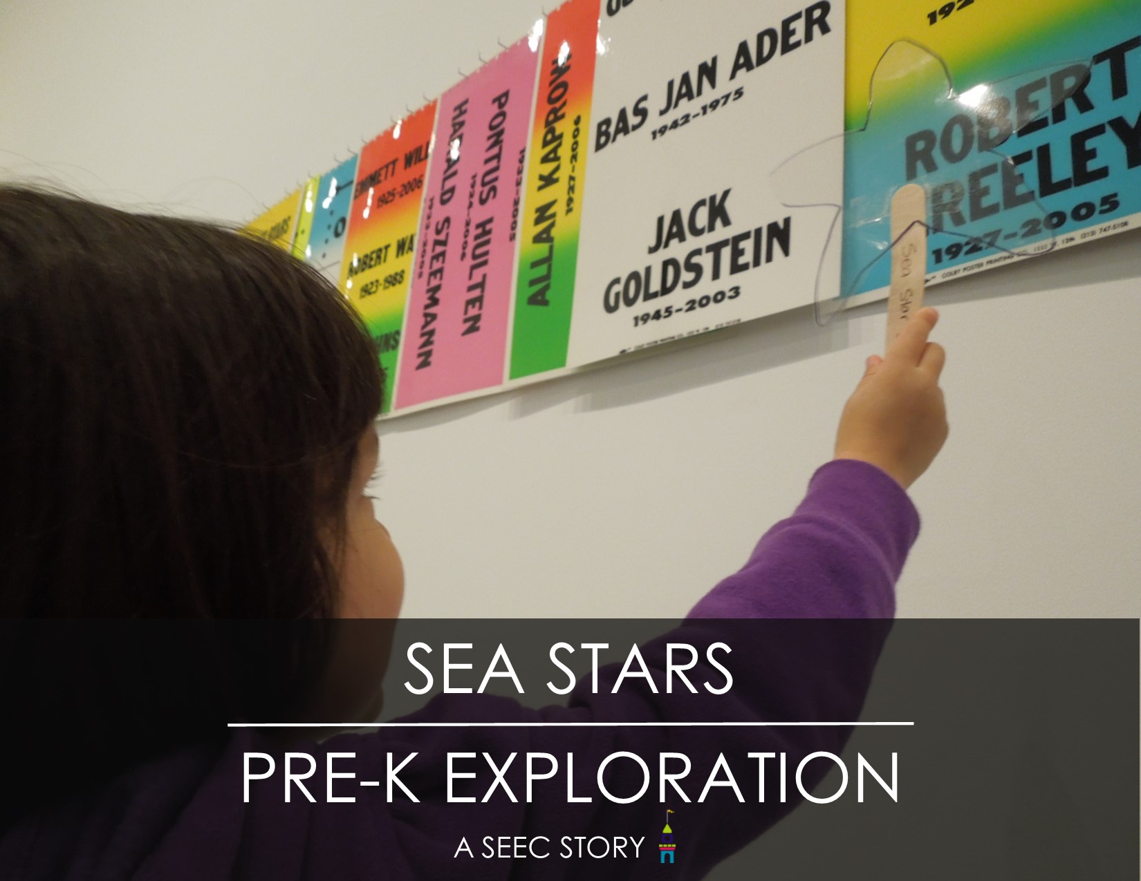 We have been building conversation skills, as well as early math and literary skills with our class. We incorporated turn taking, using a quiet hand to be called on, and various other fundamental skills, in addition to the learning about the sea star and its life in the ocean. On this particular day, we wanted them to appreciate the art around them, and the boundaries of visiting a museum. We also wanted them to learn that it is incorrect to say starfish, instead, say sea stars because they are not fish as they do not have gills or fins.