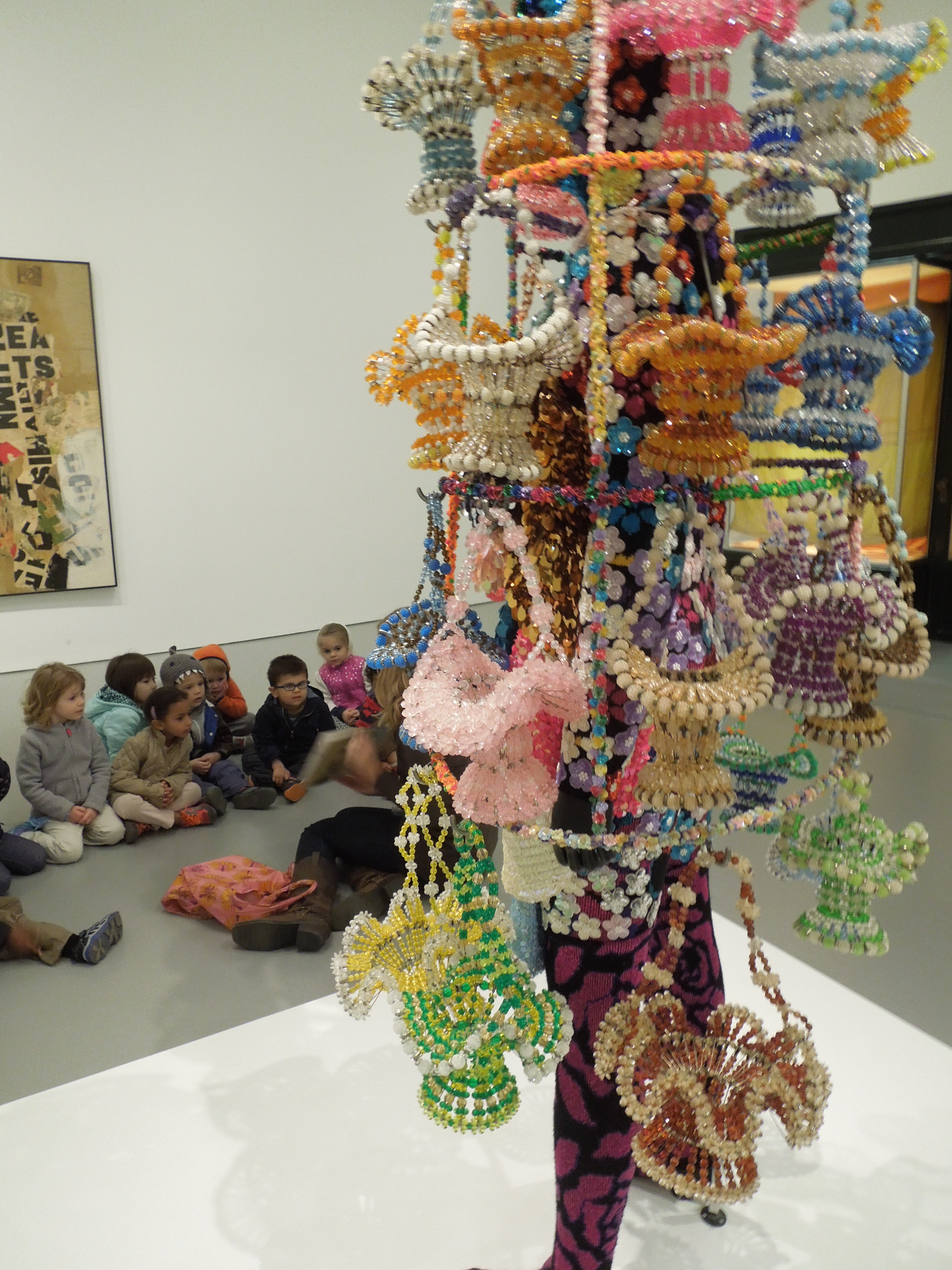 In guiding their looking and letting the students describe to the group what they saw, I was happy to hear how drawn my class was to the piece, as I had hoped, helping us reach our objective of making things more approachable. While the suit may seem daunting or scary at first, close looking showed them that it was made of beads and a bunny, not so scary of things!