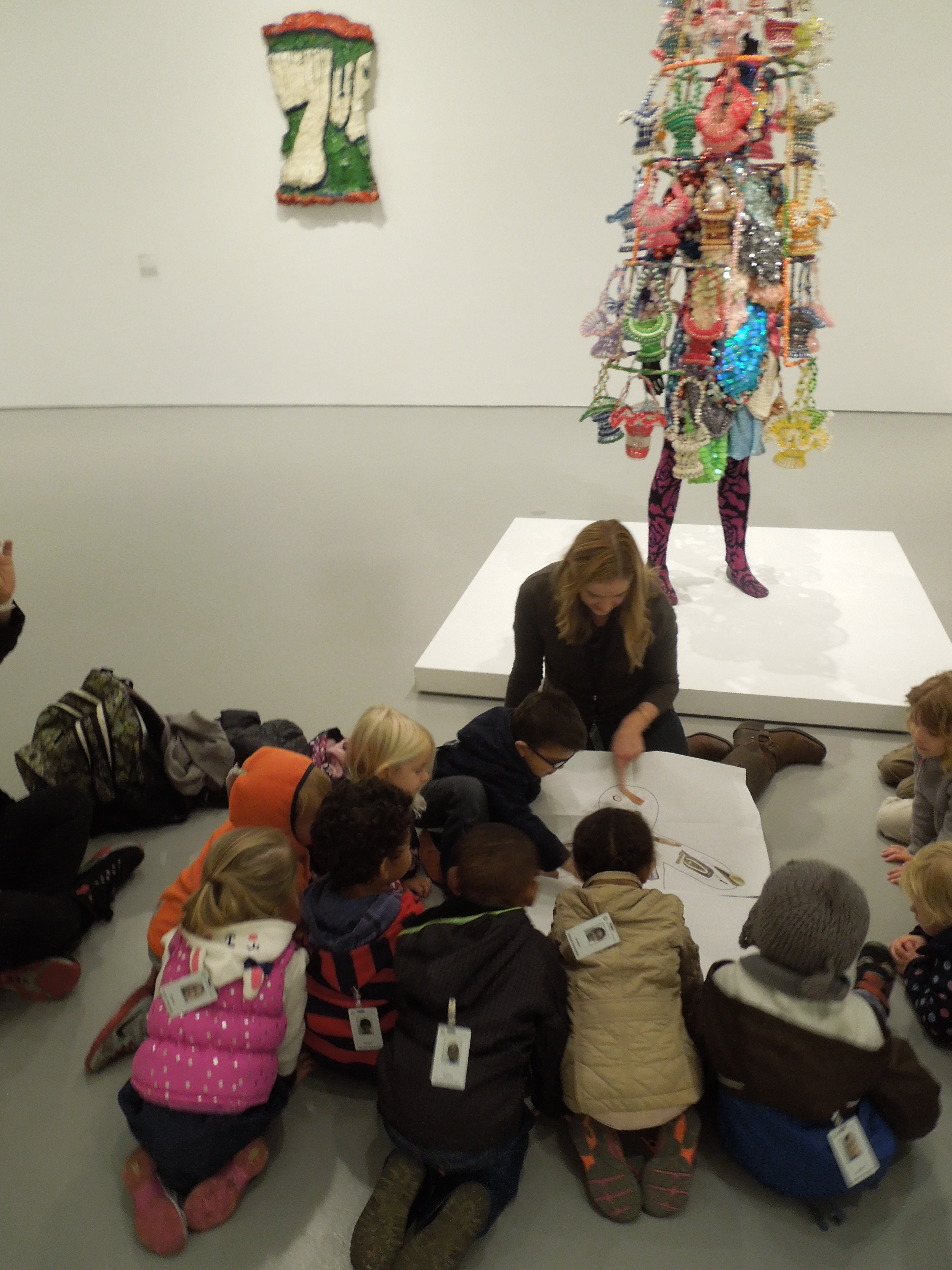 I had really hoped to use our class tablet to share a video of the artist making his sound suit out of different objects, but we had technical problems with accessing it. I think it would have made a nice addition to further draw the connection to many parts making a whole. Working in a museum environment also means you have to be careful about what materials you bring in, so I didn’t feel comfortable with my students using drawing materials on the monster template as I had hoped. Instead, those will be fun to use later in an extension activity back in the classroom!