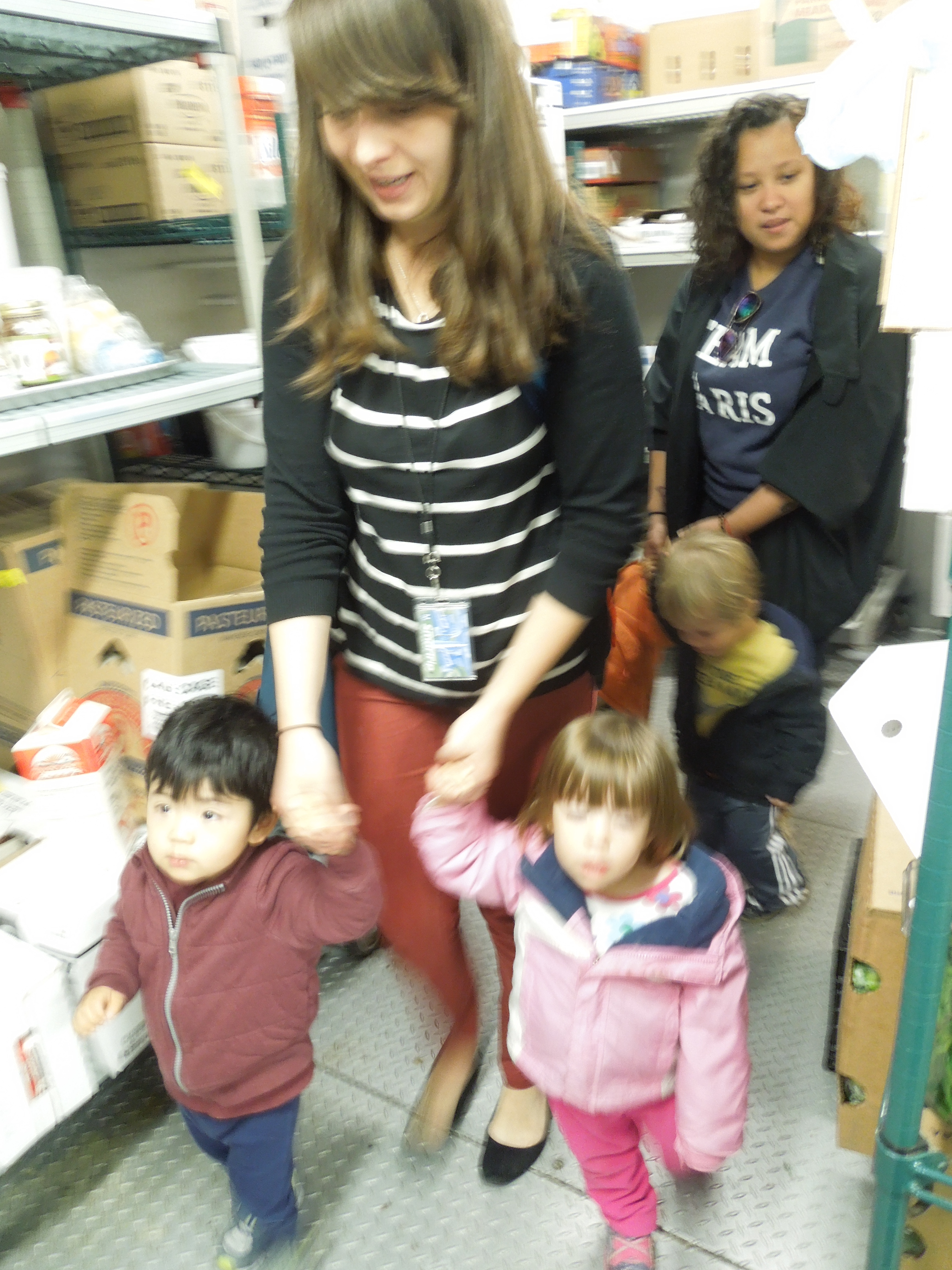 First Dana and Erin asked each child in their circle what they saw in the painting and recorded what they said. Next they went around the circle again and asked each child what they thought about what they saw. Lastly, they asked each child what they wondered about the painting. This gave the children time to observe and think about the painting, and also gave them a turn to talk frequently, keeping them engaged in the activity.