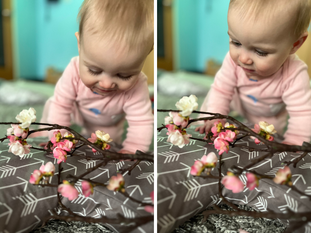 Sensory exploration is a great entry point for our age group, so our goal was for our kids to get familiar with the sights, smells, and textures of spring. We paid attention to their reactions to see where their curiosities were leading them.
