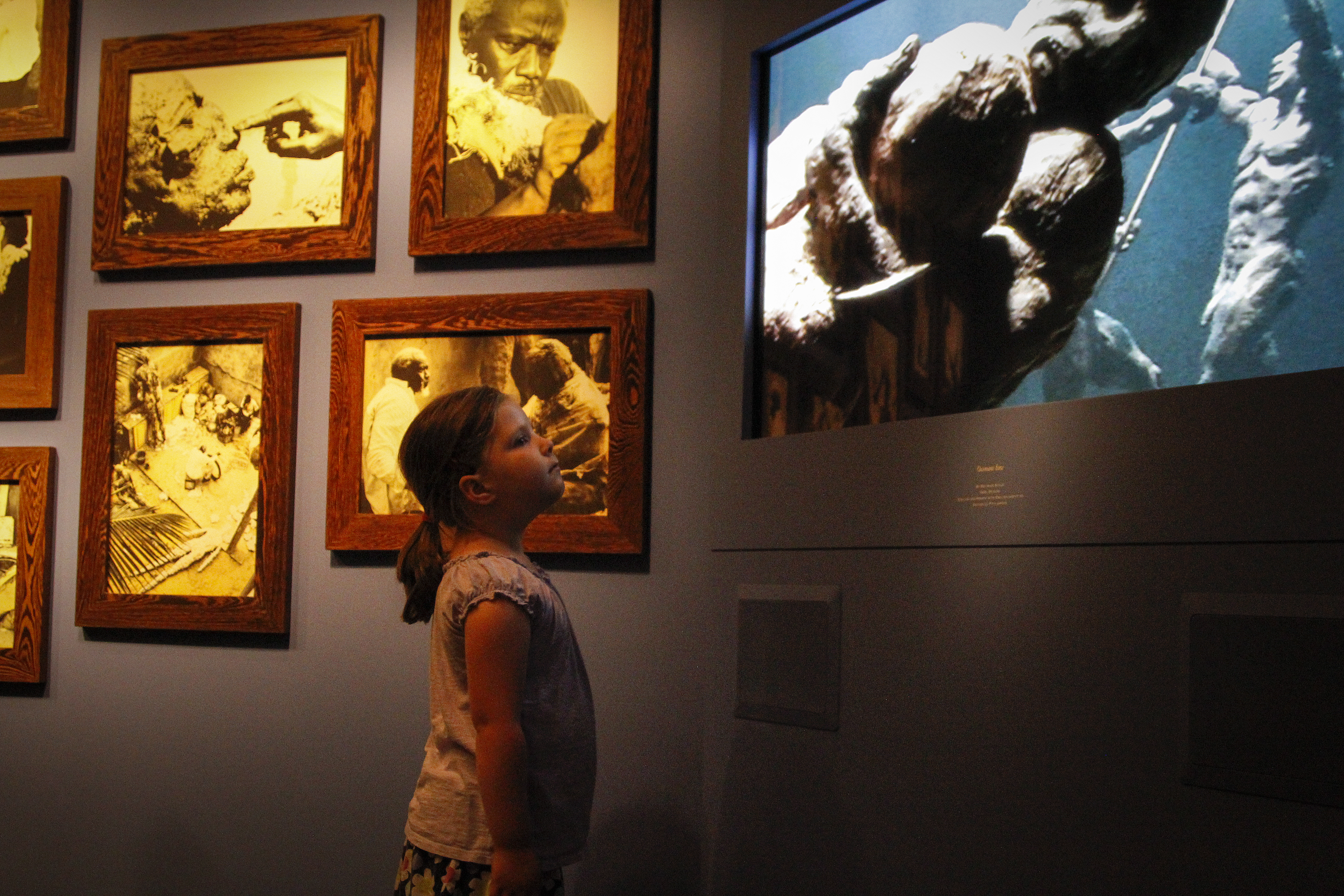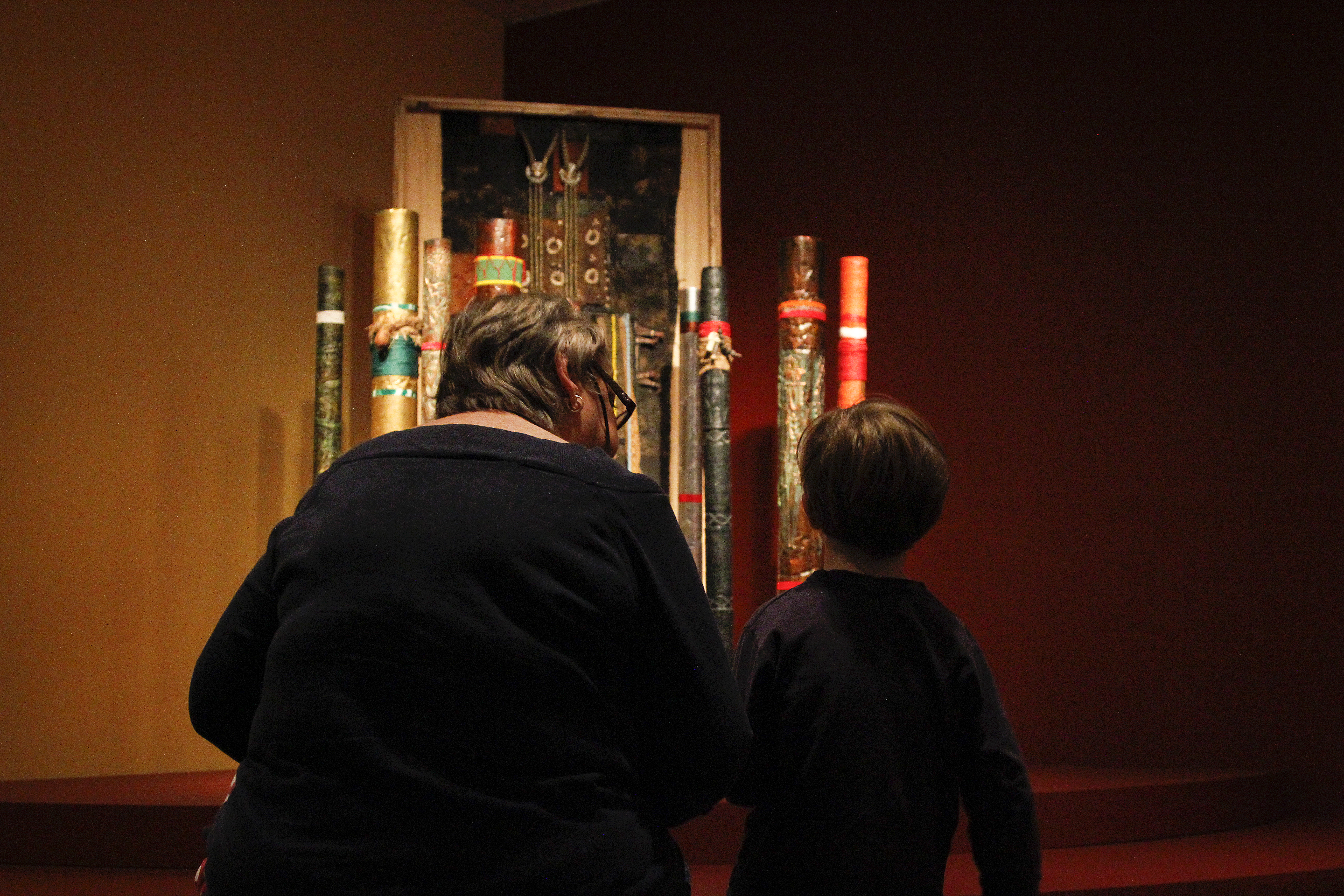 I was surprised that they found the lighting and signs appealing. Like any exhibit featuring paper, it is a dark space, and I assumed that would be unappealing. Interestingly when the exhibit designer talked to the students during their first visit, he mentioned that the low lighting help protect the books. I wonder if that made a difference. I also wonder if it was the spotlighting to which they felt drawn. Despite the overall darkness, light was strategically positioned to make the cases pop. There was minimal distraction.